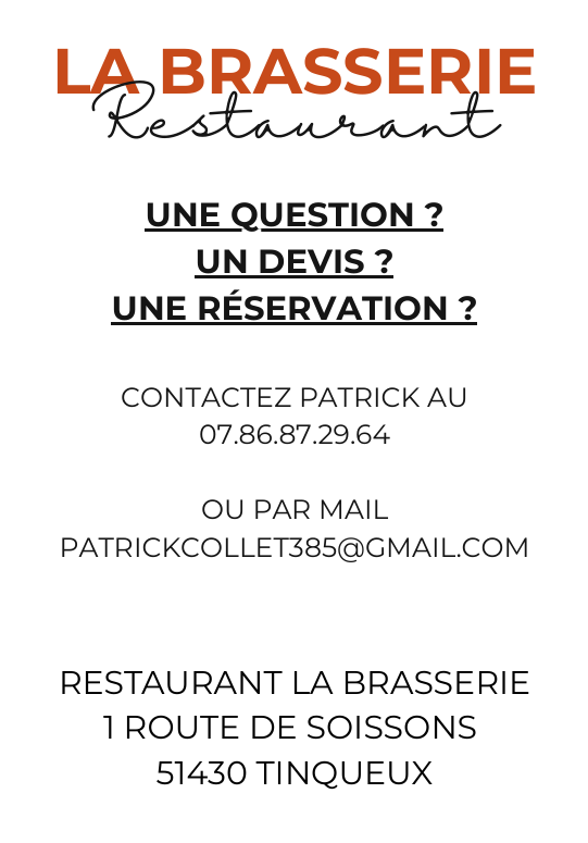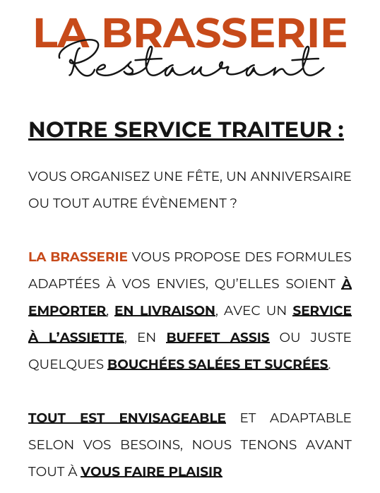 La Brasserie c’est aussi un service traiteur pour vos événements familiaux ou professionnels. Devis sur demande, consommation sur place, ou à emporter. Également, possibilité de livraison dans un rayon de 20km environ. Petits fours salés ou sucrés, plats uniques, plateaux d’amuse-bouche. Tout est possible, nous nous adaptons à vos besoins, et tout est fait maison !